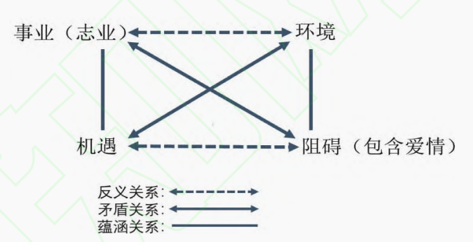 將作品代入圖3這一“意義矩陣”之中進行內容賦值,可以清晰地呈現其深層敘事結構,由此闡釋其閱讀接受中所出現的相應問題。例如沉筱之的古言作品《青云臺》,“事業(yè)”是對于洗襟臺坍塌一案的清查,“環(huán)境”則由各個階層合力鑄成,密不透風,雖然各方立場不同,但是他們各自注入洗襟臺的私欲都讓真相難以被揭開。舊日工匠、書生、山匪等角色的接連出現衍生出了主人公的追尋軌跡,而言情線“不由自主”地拖累著事業(yè)線這一主線的推進。溫小野與小昭王的言情線每一展開,敘述時間便延宕下來。尤其是下卷中,各方勢力的聯合“絞殺”為懸案的加快偵破帶來緊迫性,但言情線上時間流速的舒緩與行動要求的快節(jié)奏相矛盾,造成了彼此氛圍“對沖”的效果。所以,雖然溫昭二人的“愛情”并不與“事業(yè)”相對立,卻不由得建立了“反義關系”。作者沉筱之為了避免因兩條線索“打架”影響故事的發(fā)展,放棄了言情線的繼續(xù),而讀者也紛紛詬病懸疑線的拖沓和言情線的驟然消失。
