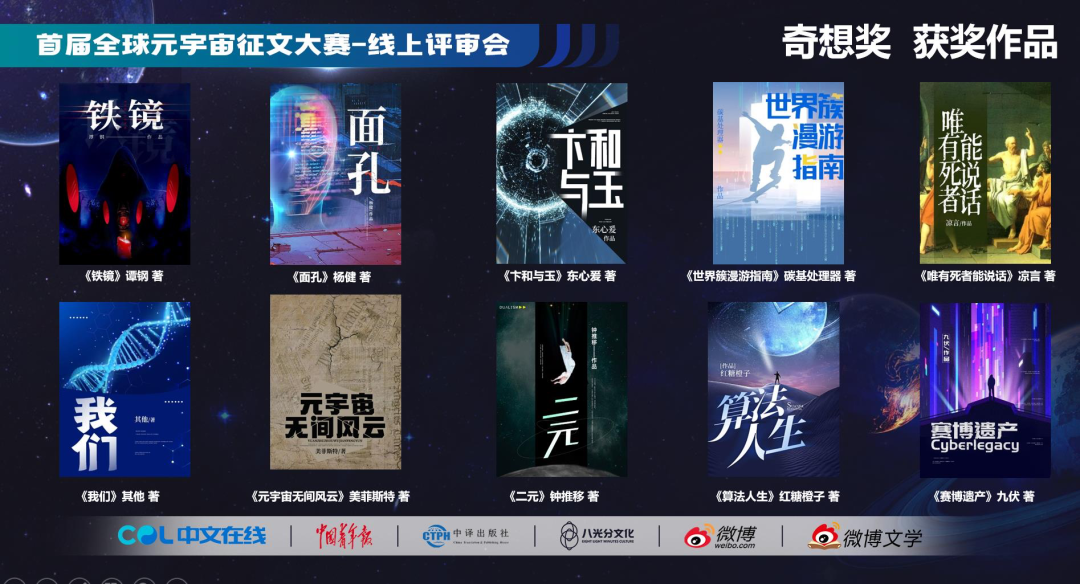7月31日,中文在線的全球元宇宙大賽奇想獎(科幻小說類)揭曉,十部獲獎作品從上萬部參賽作品中勝出,每部獲獎金10萬元,共100萬元,中國科幻的第一個百萬大獎?wù)Q生(四屆京東文學(xué)獎科幻獎1名,純獎金20萬元)。我隱隱約約地感覺到,“《三體》后時代”的中國科幻界,正在元宇宙題材上殺出一條血路,離突破性的作品出現(xiàn)的時間不遠了 。