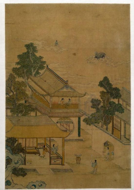 清代姚文瀚的《七夕圖》則分別從三條線索,真實(shí)展現(xiàn)了宮廷盛大的七夕活動:首先是牛郎織女于鵲橋相會,著意于男耕女織治農(nóng)勸桑,再通過宮廷祭祀典禮的描畫,來寓意五谷豐登;畫面中段為乞巧活動,臺階上佇立著奉蛛盒水碗的仕女,月臺上有女子拜針,巧樓左側(cè)有仕女面向織女舉手乞巧,人物個個栩栩如生;畫面下段的最前端是盛放的蓮花池,月臺上、庭院中供奉有“磨喝樂”,并分散著“六藝”教育的童子,暗示著七夕求子育兒的習(xí)俗。