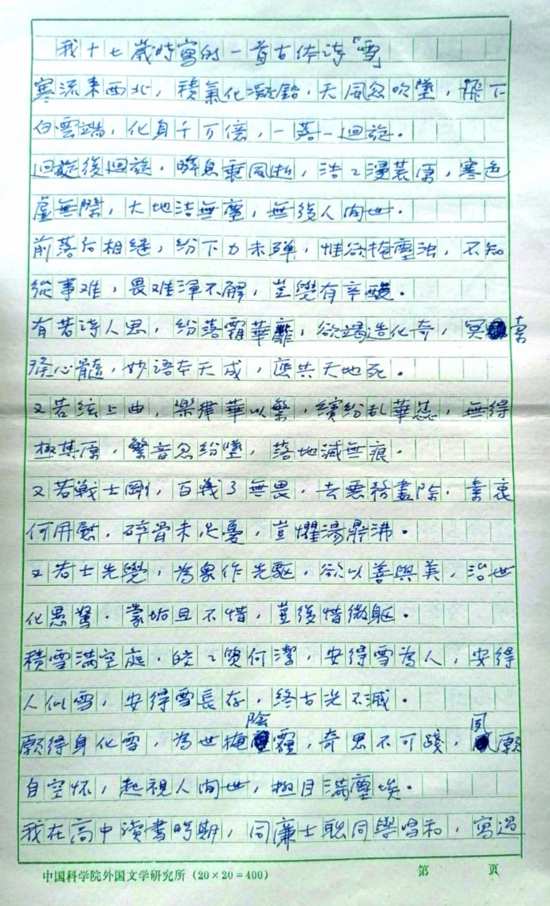 整批手稿,紙本九份,共計(jì)96頁(yè),題目如下:《我十七歲時(shí)寫的一首古體詩(shī)〈雪〉》《解放戰(zhàn)爭(zhēng)雜憶》《我與民聯(lián)》《解放后的風(fēng)風(fēng)雨雨(1949—1952年底)》《解放后的風(fēng)風(fēng)雨雨(到北京以后到1957年反右運(yùn)動(dòng))》《解放后的風(fēng)風(fēng)雨雨(反右到“文革”)》《解放后的翻譯工作、外文社、中國(guó)文學(xué)及其他(到“文革”為止)》《“文革”十年》《過(guò)去十年》。由此可知,除第一篇和早年生活有關(guān),內(nèi)容全是40年代后期至晚年的經(jīng)歷,等于楊老的后半生自傳。