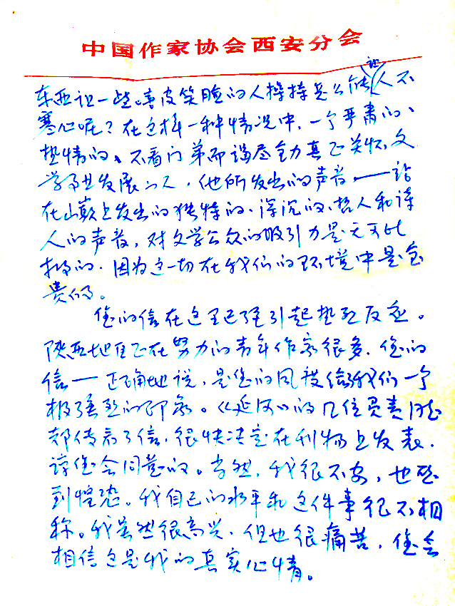 您的信在這里已經(jīng)引起熱烈反應(yīng),陜西地區(qū)正在努力的青年作家很多,您的信——正確地說,是您的風(fēng)度給了我們一個極強(qiáng)烈的印象?!堆雍印返膸孜回?fù)責(zé)同志都傳看了信,很快決定在刊物上發(fā)表,諒您會同意的。當(dāng)然,我很不安,也感到惶恐。我自己的水平和這件事很不相稱。我雖然很高興、但也很痛苦,您會相信這是我的真實心情。