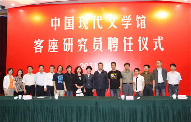 2011年5月19日,李云雷、張莉、房偉、楊慶祥、周立民、梁鴻、霍俊明七人獲聘中國現(xiàn)代文學館首屆客座研究員。周立民(右五)在現(xiàn)場。