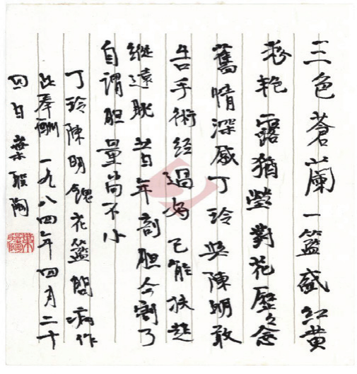 丁玲晚年曾多次去看望葉圣陶先生,無論是先生壽辰還是生病住院,她總要送上誠摯的祝福與問候。1984年3月,年逾九旬的葉圣陶老人因膽結(jié)石住院。家人非常擔(dān)心,猶豫不決,葉老卻十分樂觀,斷然同意做了膽囊切除手術(shù)。丁玲、陳明夫婦得知消息,帶著花籃前往醫(yī)院看望。葉老十分感懷,手術(shù)后第六天,他便在病榻上寫下《丁玲陳明饋花籃問病作此奉酬》一詩。丁玲在《附記》中說:“此詩作于四月廿三日病榻上,即手術(shù)后第六天;四月二十四日手抄寫下?!比~老將這首七言律詩用墨筆抄在16開的豎格紙上,因大病未愈,字跡有些歪歪扭扭,但仍舊清晰整潔。并在款識(shí)“葉圣陶”下方鈐“葉圣陶”(朱文)姓名章一方。