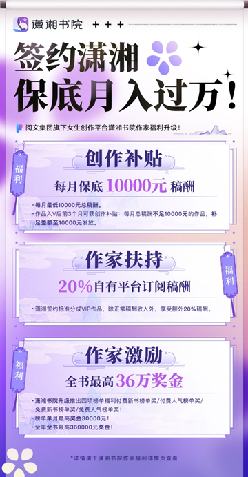9月14日,閱文集團(tuán)旗下瀟湘書院發(fā)布全新作家福利,升級推出瀟湘開站四大福利,含保底稿酬月入過萬,全年全書最高36萬元獎(jiǎng)金激勵(lì)等。這是瀟湘書院投入一億資金扶持女性創(chuàng)作者,重磅發(fā)布“紫竹計(jì)劃”后的重要舉措。