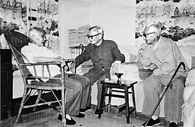 1982年7月7日下午,朱光潛(左)、茅以升(中)、宗白華三位老學(xué)者在朱光潛家會面談心 資料圖片