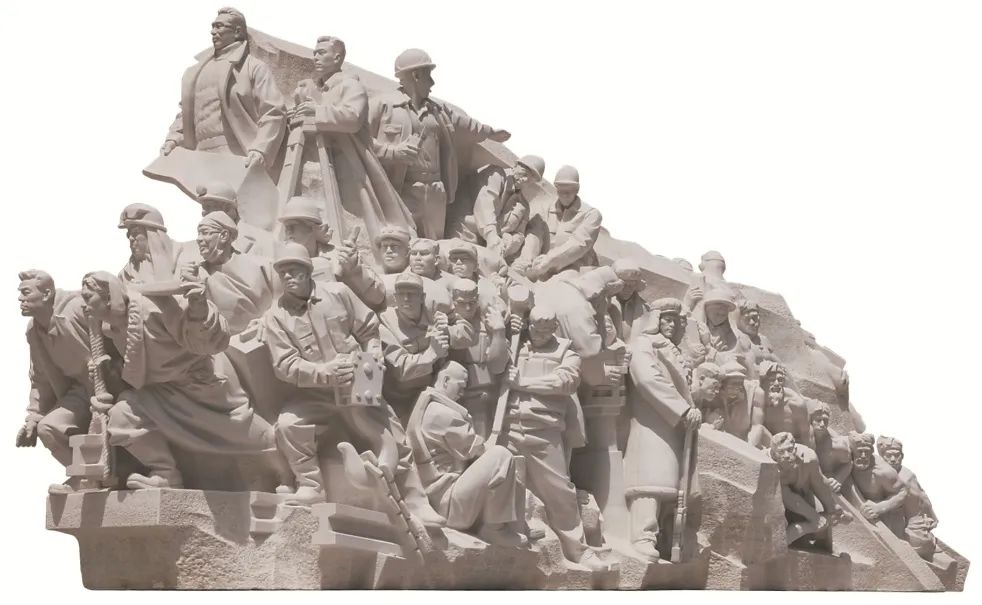 邁入西側(cè)廣場(chǎng),莊嚴(yán)矗立的5座大型主題雕塑,給人以視覺(jué)震撼和精神力量——《旗幟》“迎風(fēng)招展”、氣勢(shì)如虹;《信仰》《偉業(yè)》《攻堅(jiān)》《追夢(mèng)》4組雕塑渾然一體、巍峨壯觀(guān)。583塊來(lái)自四川夾金山腳下的漢白玉,雕刻成276個(gè)栩栩如生的人物,匯聚為波瀾壯闊的視覺(jué)史詩(shī),生動(dòng)講述著黨的百年光輝歷程。它們是新時(shí)代美術(shù)工作者為人民放歌、為時(shí)代鑄魂的典范之作。