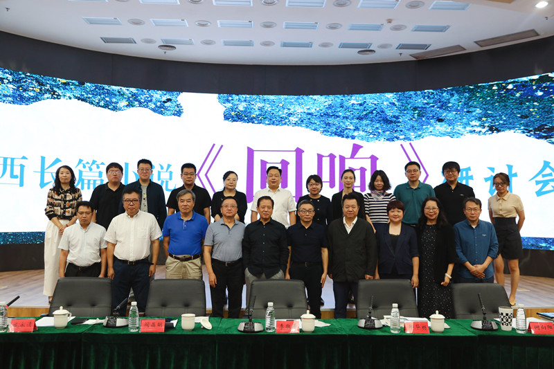 東西長(zhǎng)篇小說(shuō)《回響》研討會(huì)合影。第一排左起:李紅強(qiáng)、臧永清、潘凱雄、閻晶明、李敬澤、東西、邱華棟、何向陽(yáng)、張燕玲、李洱;第二排左起:劉稚、宋嵩、饒翔、徐則臣、張莉、徐濤、李東華、趙萍、岳雯、陳濤、叢治辰、李蔚超。