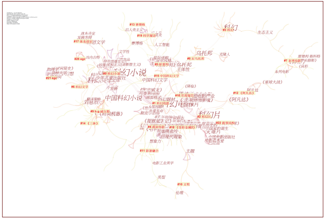 中心性反映了在關(guān)鍵詞網(wǎng)絡(luò)中的重要性與連接度,中心性數(shù)值越高表明該節(jié)點越重要。如表1所示,科幻電影(0.92)、科幻片(0.61)、反 烏托邦(0.49)、科幻文學(xué)(0.46)等詞匯是科 幻研究的核心內(nèi)容,表明我國科幻研究多基于文 學(xué)與影視展開考究。反烏托邦是烏托邦的相對概 念,“把展望未來理想社會的烏托邦描寫作為諷 刺幽默手段加以運用”[1],為了直面和處理“更 悲慘的生活”[2]。作為科幻文藝的亞類,反烏托 邦體現(xiàn)了對所有理想化社會愿景的基本懷疑,以 批判的視角反思科技與人類社會的關(guān)聯(lián),對于問 題化的社會和政治實踐提供了一種新觀點[3]。