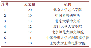 高校與科研機構(gòu)是科學(xué)研究創(chuàng)新發(fā)展的重要陣地,集中了重要的科學(xué)研究資源,能夠更好地驅(qū)動知識生產(chǎn)與成果轉(zhuǎn)化。在研究機構(gòu)統(tǒng)計分析過程中,筆者以二級單位名稱為準(zhǔn),在標(biāo)準(zhǔn)化處理結(jié)果中得到發(fā)文機構(gòu)364個。其中北京大學(xué)藝術(shù)學(xué)院、中國科普研究所、北京大學(xué)中文系、廈門大學(xué)人文學(xué)院、北京師范大學(xué)文學(xué)院、中國傳媒大學(xué)戲劇影視學(xué)院、上海大學(xué)上海電影學(xué)院的發(fā)文量均達到10篇及以上,對于科幻研究領(lǐng)域的發(fā)展起到了重要的推動作用(見表4)