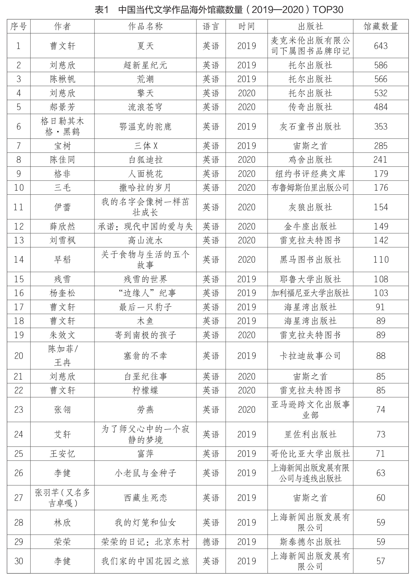 筆者在2021年6月至8月,用近兩個(gè)月的時(shí)間依托于世界圖書(shū)館聯(lián)機(jī)書(shū)目數(shù)據(jù)庫(kù)(OCLC)、日本情報(bào)研究所(Cinii Books)、JSTOR電子書(shū)數(shù)據(jù)庫(kù)、世界主要媒體數(shù)據(jù)庫(kù)(News Bank)、道瓊斯媒體數(shù)據(jù)庫(kù)(Factiva)、亞馬遜網(wǎng)與Goodreads等專(zhuān)業(yè)數(shù)據(jù)庫(kù)與互聯(lián)網(wǎng)平臺(tái),搜集和梳理了2019—2020年近100部中國(guó)當(dāng)代文學(xué)作品的海外館藏?cái)?shù)據(jù)、讀者反饋和專(zhuān)業(yè)媒體報(bào)道數(shù)據(jù),從海外館藏(傳播范圍)、媒體書(shū)評(píng)或同行評(píng)價(jià)、讀者反饋等三個(gè)維度,對(duì)2019—2020年中國(guó)當(dāng)代文學(xué)海外傳播情況進(jìn)行了全方位分析,具體情況如下。
