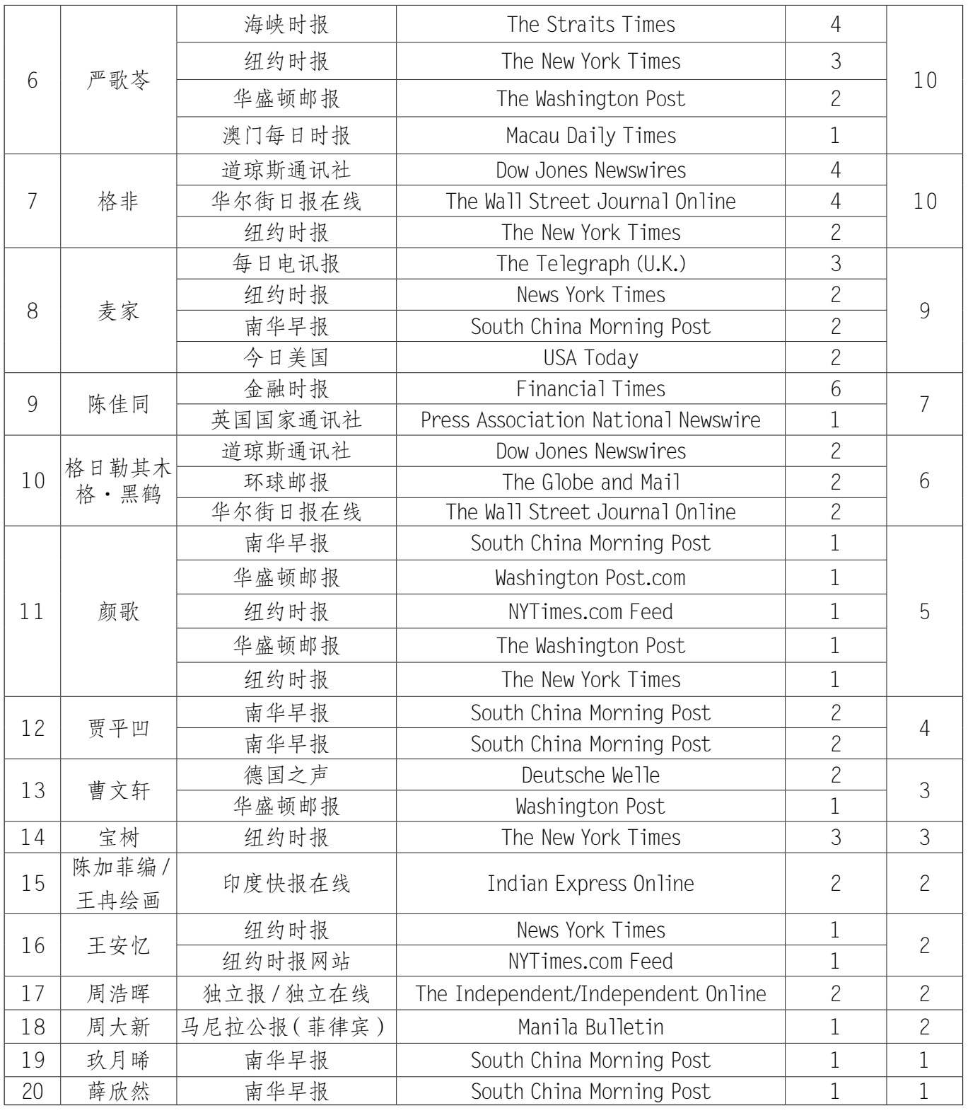 如《紐約時(shí)報(bào)》,第一次以“《三體》為美國(guó)科幻小說(shuō)迷換口味”為題,在2014年11月10日刊發(fā)了正面書(shū)評(píng),認(rèn)為“目前美國(guó)的很多頂尖科幻小說(shuō)作家摒棄傳統(tǒng)的外星人入侵情節(jié),更青睞反映現(xiàn)實(shí)世界的題材,諸如氣候變化和性別轉(zhuǎn)變之類(lèi)”,而《三體》是第一部講述異于地球的三體人文明與地球人互動(dòng)的故事,這種不同文明之間沖突的故事會(huì)更受美國(guó)讀者的青睞。此后有關(guān)劉慈欣《三體》的書(shū)評(píng)分別出現(xiàn)在英國(guó)《衛(wèi)報(bào)》《每日電訊》《海峽時(shí)報(bào)》,美國(guó)《華爾街日?qǐng)?bào)》《芝加哥論壇報(bào)》《大西洋月刊》《紐約客》《洛杉磯時(shí)報(bào)》,美國(guó)公共廣播電臺(tái)、美國(guó)康納仕集團(tuán)GQ雜志,澳大利亞《悉尼先驅(qū)晨報(bào)》《澳大利亞人報(bào)》,印度快報(bào)雜志等主流媒體,以及專(zhuān)業(yè)科幻類(lèi)雜志,如軌跡(Locus)雜志、網(wǎng)站,專(zhuān)業(yè)科技類(lèi)雜志有線(WIRED)雜志、網(wǎng)站,專(zhuān)業(yè)物理空間雜志《物理學(xué)(Phys)》、網(wǎng)站等近200多家主流大眾媒體與科學(xué)幻想類(lèi)、物理學(xué)類(lèi)等專(zhuān)業(yè)媒體。依據(jù)Factiva 數(shù)據(jù)庫(kù)在2021年8月的份檢索,得到劉慈欣在2019至2020年兩年在英語(yǔ)世界的主流媒體展露次數(shù),見(jiàn)表6。