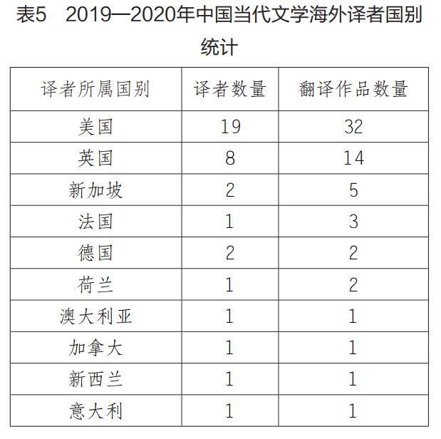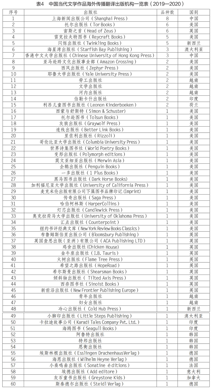 文本的對(duì)外翻譯依舊是中國(guó)當(dāng)代文學(xué)海外傳播的核心與關(guān)鍵。通過(guò)本次研究發(fā)現(xiàn),中國(guó)當(dāng)代文學(xué)作品的譯介模式,已經(jīng)從零散、個(gè)體的譯介向中外聯(lián)合的機(jī)制化、組織化譯介模式轉(zhuǎn)變。這也是一個(gè)非常重要的變化。中國(guó)當(dāng)代文學(xué)作品的對(duì)外翻譯與介紹,一直是由少數(shù)漢學(xué)家、中國(guó)當(dāng)代文學(xué)研究專(zhuān)家的個(gè)人學(xué)術(shù)興趣所主導(dǎo),因而中國(guó)當(dāng)代文學(xué)的對(duì)外譯介長(zhǎng)期處于零散、偶發(fā)、不系統(tǒng)的狀態(tài)。2019—2020年度的數(shù)據(jù)顯示,這種譯介狀態(tài)正在發(fā)生轉(zhuǎn)變,由中國(guó)大陸出版機(jī)構(gòu)、中介服務(wù)機(jī)構(gòu)所進(jìn)行的組織化、機(jī)制化翻譯模式已經(jīng)逐漸形成。