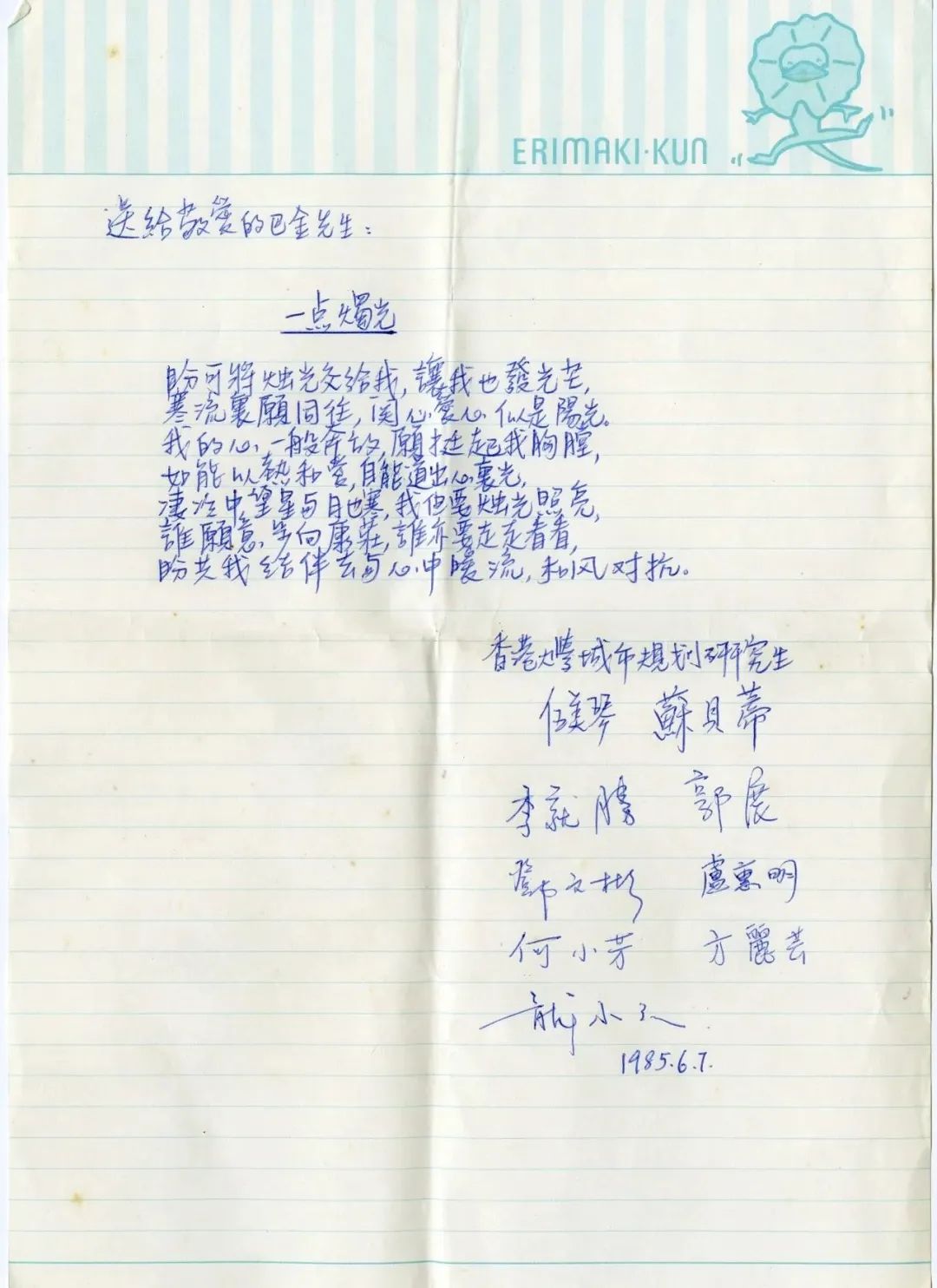 在巴老面前唱歌的是香港大學(xué)城市規(guī)劃研究生代表團的十位學(xué)生,抄錄歌詞的信箋下方有他們各自的簽名,第一個簽名的伍美琴,在一個多月后寫過一篇《一次幸福的會見——巴金先生訪問記》刊登在當(dāng)年7月31日和8月1日的《大公報》上,其中寫道:“由于我們用廣東話唱,為了使他聽得懂,便預(yù)先抄好了。在他面前,我們十個人輕輕地唱,當(dāng)唱到‘盼可將燭光交給我,讓我也發(fā)光芒……以心中暖流,和風(fēng)對抗?!瘯r,我心底深處,也就發(fā)出了強烈的祈盼,希望巴金先生好好地保重身體,把火炬交給新一代的中國青年!”