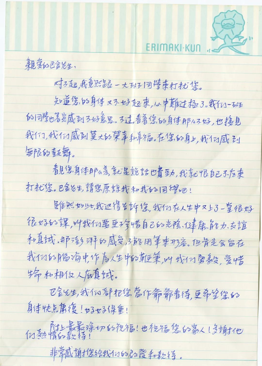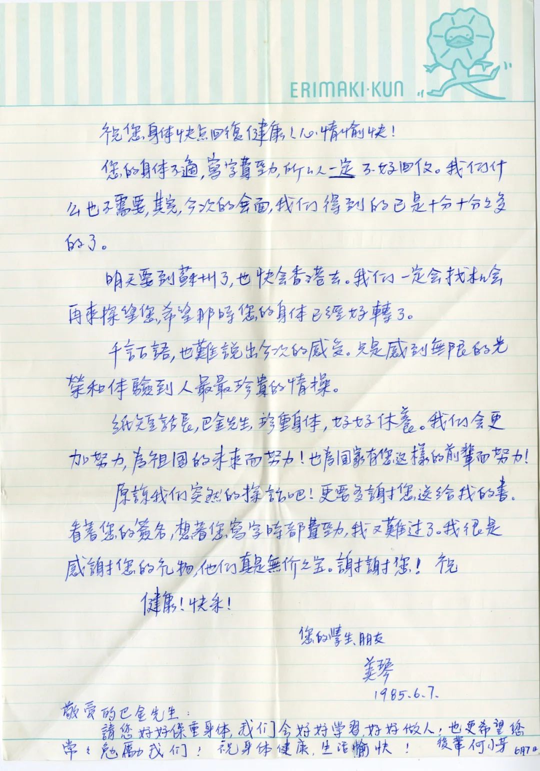 第二天,當(dāng)他們要離開上海之際,伍美琴給巴老寫了兩頁的長信,傾訴見過巴老后的激動,她特別談道:“我還得告訴您,我們在人生中又上了一堂很好很好的課,叫我們要更珍惜自己的光陰、健康、能力、友誼和真誠。那澎湃的感受,不能用筆來形容。但肯定會留在我們的腦海中,作為人生中的鞭策,叫我們勇敢、愛惜生命和相信人的真誠。”并再一次說:“巴金先生,我們都很把您當(dāng)作爺爺看待……”同時表達了這樣的決心:“紙短話長,巴金先生,珍重身體,好好休養(yǎng)。我們會更加努力,為祖國的未來而努力!也為國家有您這樣的前輩而努力!”署名是“您的學(xué)生、朋友美琴”。是的,青年是學(xué)生,讀者也是朋友。默默中,把溫暖和力量傳遞給新一代青年人。