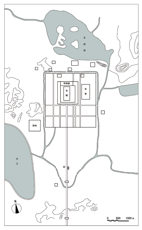 在梁朝之前,建康華林園的主要景致已經(jīng)建成,山水佳勝,花木繁茂,殿堂樓臺(tái)連綿起伏。其總體格局模仿曹魏時(shí)期的洛陽(yáng)華林園,西北部堆筑大土山,稱“景陽(yáng)山”,東南部開辟大片水池,名為“天淵池”。