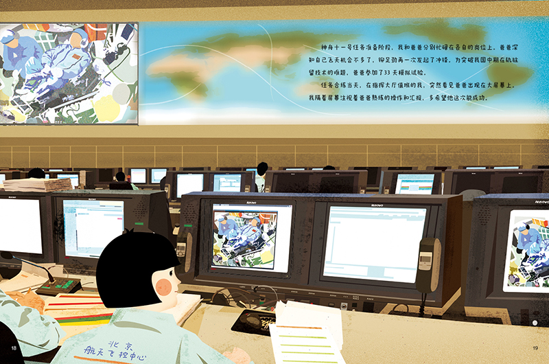 趙墨染:2016年我在清華美院讀書的時(shí)候選擇做科普繪本的研究,有了一些科普繪本的創(chuàng)作經(jīng)驗(yàn)。2018年中國少年兒童新聞出版總社的唐威麗老師聯(lián)系到我說有這樣一個(gè)航天員的故事,問我感不感興趣。本身我對航天題材也很感興趣,看了鄧清明父女《朗讀者》的節(jié)目后,被深深地打動(dòng)了。之后在出版社的安排下我和鄧清明的女兒滿琪見面了,自此開始了我們?nèi)甑膭?chuàng)作之旅。這三年我們線上線下溝通了多次,她給我提供了非常詳盡的資料。比如故事的腳本,相關(guān)的影像資料,參考書籍、電影和紀(jì)錄片等等。從文字到分鏡圖再到正稿,滿琪很認(rèn)真地校對每一處。因?yàn)樗鳛楹教烊说膶I(yè)背景,有她在我會(huì)很踏實(shí)。說到印象最深的瞬間是神舟十一號(hào)任務(wù)準(zhǔn)備階段,滿琪在指揮大廳值班看到爸爸出現(xiàn)在大屏上,她眼含淚水的樣子讓我難忘。