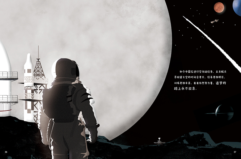 趙墨染:科普類型的繪本創(chuàng)作更需要大量的資料研究和科學(xué)求真的精神。盡可能多看資料,多去實(shí)地考察。就怕創(chuàng)作時(shí)需要畫,卻沒有素材可參考。要在有限的體量內(nèi),講清楚想表達(dá)的故事,對資料的分類整理必不可少。如何將這些素材編輯好,講好這個(gè)故事也是研究重點(diǎn)。比如一開始做《爸爸的秘密》這本書,書中涉及航天專業(yè)知識(shí)的圖形化對我來說確實(shí)是個(gè)難關(guān),但隨著創(chuàng)作的深入,資料收集越來越充分時(shí),我開竅了,也得心應(yīng)手起來。關(guān)于航天員訓(xùn)練、中國航天大事記、航天器等畫面我運(yùn)用了視覺傳達(dá)設(shè)計(jì)中的信息圖表的方法,按照時(shí)間線分類以及做兒童喜歡的圖形化的設(shè)計(jì),在排版上注意圖文的關(guān)系,讓讀者更清晰地了解這些科普知識(shí)??偨Y(jié)而言是對內(nèi)容的理性梳理和感性呈現(xiàn)。