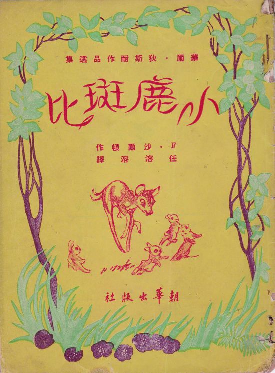 《小鹿斑比》出版于民國三十七年十月(公元1948年),由朝花出版社出版。這是我見到的任溶溶最早出版的一種譯著。1946年,任溶溶從大夏大學(xué)(華師大前身)畢業(yè),因有同學(xué)在《兒童故事》雜志當(dāng)編輯,請他提供作品,他就開始翻譯些外國兒童作品。為了找原著,他經(jīng)常去淘書,尤其是在上海大馬路(今南京東路)別發(fā)洋行內(nèi)的一家外文書店,常常看到由美國迪士尼公司繪制、薈萃歐美各國優(yōu)秀兒童作品的原版卡通童書,這觸發(fā)了他的靈感,心想,如果把它翻譯成中文,一定會受到中國兒童的喜愛。于是,他淘來這些外國原版兒童書,開始一部部翻譯起來,一口氣譯了六種,起了個名稱“華爾·狄斯耐作品選集”。書很快就譯出來了,他想得趕快出版呀,他太喜歡這些讀物了,想想不肯輕易交給人家出版社出書,那就干脆自己辦一個出版社吧,取名叫“朝花出版社”,社址當(dāng)然就是他自己的寓址,在“上海四川路五七二弄四號”,請他大夏大學(xué)中文系恩師、大名鼎鼎的郭紹虞教授題寫了社名。書印出來了,郭教授一看,對他說,我是豎寫的,怎么印成了橫排的字,書法橫寫與豎寫,運筆和氣勢是不一樣的。這么一聽,任溶溶也傻了:怪自己不懂書法,對不起老師的一手好字。出版社印書,首需的是紙張,這不愁,任溶溶的父親是開紙張店的小老板,就搬點紙交給長樂路上一家印刷小作坊,父親還付了些印刷費,算是給兒子出書的贊助吧。任溶溶請來好友、畫家沈滌凡先生任美術(shù)編輯,書很快就印出來了。不是一本,而是六本一套的叢書。雖然是薄薄的,卻是很可愛的裝幀設(shè)計。由于任溶溶的翻譯,中國小朋友讀者第一次閱讀到了中文版的迪士尼童話作品,真是有福??!因為,在這之前,標(biāo)有迪士尼的作品,只有漫畫在我國的外文報刊上登過,只有原版外語動畫片在租界放映過。而將迪士尼童話故事譯成中文出版,任溶溶具有開創(chuàng)之功。