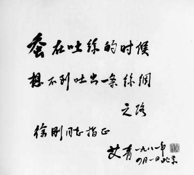 當其時也,艾青進入了一個新的創(chuàng)作高峰期,每有新作,我和楊兆祥,還有周明,總是先睹為快者。長詩如《光的贊歌》等,給《人民文學(xué)》,他們有版面;短詩則歸《人民日報》的《大地》副刊。除了索稿,更多的時候是聊天。我們在艾青家或是附近的館子吃飯,艾青牙齒不好,他愛吃“燉得爛爛的肉”。其間,艾青又搬往北緯飯店暫住,離我寄居的華仁路31號只一箭之遙。那時,《光明日報》《詩刊》的社址均在附近,艾青的住處便成了一眾詩人的聚集地,那是詩的聚集、語言的聚集、激情的聚集。這樣的聚集又是如此純凈:只是為了看望艾青,只是因為對詩的熱愛。那熱烈的話語聲,是“純金的三輪馬車,在生活的曠野上馳騁”的聲音。