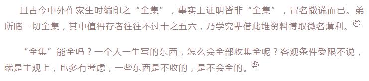 至于編纂全集的效果,對于作者來說,可能增光,也可能受損?。我在談?wù)撊绾尉幦瘯r(shí),曾提及:“編者之所以不遺余力,非要窮盡所有資料不可,有時(shí)是不忍埋沒天才,有時(shí)是基于學(xué)術(shù)判斷,有時(shí)則只是為了顯示自家迥異常人的見識(shí)或韌性,當(dāng)然,也不乏借此牟利的。”?因此,錢鍾書謔稱編全集“乃學(xué)究輩借此堆資料博取微名薄利”?,雖稍嫌刻薄,也不能說毫無道理。