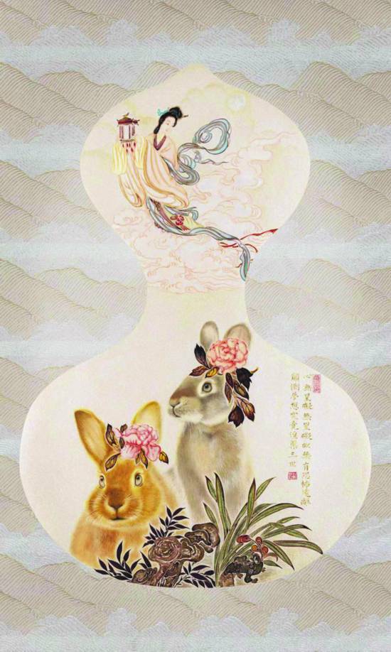 程澄的卯兔作品,讓我看到了盛大的花朵下的蟄伏的兔子,仿佛禮佛般地對(duì)花朵深情凝望??吹搅斯@之下的兔子,果籃中有我鐘愛的蓮蓬,有我覺得清吉的藕,有鮮桃有佛手,有呼之欲出的石榴,當(dāng)然也有你畫面上看不到但卻感受得到的清風(fēng)。其中有一幅畫面中,有如意,有兔子圖案的花瓶。有吉慶之時(shí)不可或缺的炮仗,有閃亮的金錢樹。還有一幅,富貴之氣的花開放得恣意而招搖,畫面中能感受到連綿的香芬。還有一幅,有如意寶瓶,有對(duì)一只蝴蝶和石榴的凝望。這些畫的構(gòu)成,有極為和諧與細(xì)致的搭配,看似不經(jīng)意卻渾然天成。比如丹柿,比如靈禽,比如嫦娥,比如祥云,凡此種種,皆為祥瑞。作品有葫蘆狀的畫心。而細(xì)細(xì)勾勒的工筆與色彩的運(yùn)用,跳躍、靈動(dòng)、鮮明,瑞兔神態(tài)各異,栩栩如生。從中我們可以通過這些性格溫良的兔子,窺見良善與和氣這一畫面溢出來的主題。這些與新鮮的植物和清新的空氣為伴的生靈,是我們塵世間不可多得的良伴。