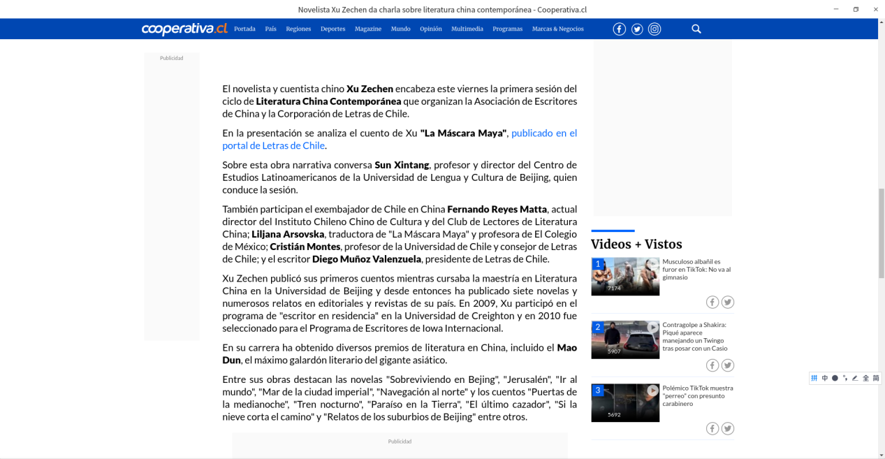 智利讀者俱樂部分享徐則臣新作《瑪雅人面具》