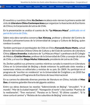本次分享會在臉書(Facebook)等當?shù)仄脚_進行直播,智利知名媒體“合作社”全程直播和深入報道。為擴大作品影響,小說西文版還在《智利文學(xué)網(wǎng)》上進行了全文刊發(fā),為中國當代文學(xué)新作快速走進智利及拉美讀者群體打開了新的路徑。