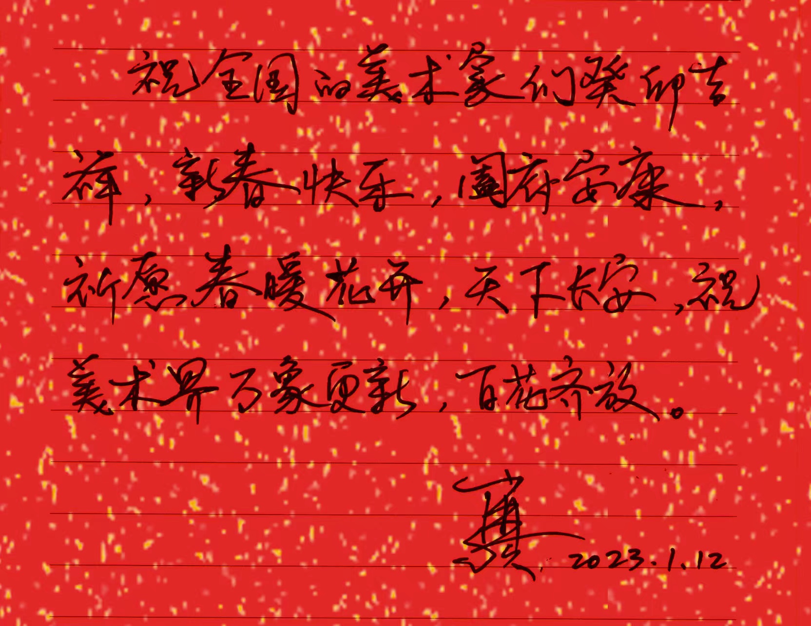 2023年,祝愿全國美術(shù)家,以誠摯的時代情感、用自己創(chuàng)造的雙手,謳歌時代、書寫出中國藝術(shù)的精氣神,共同為人民提供更豐富高雅文明、溫暖親民的藝術(shù)精神食糧,共祝愿明天會更好!