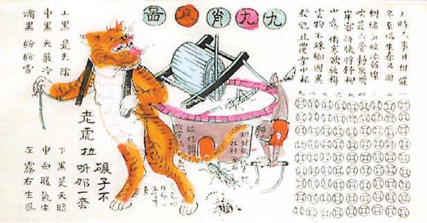 銅錢型消寒圖流傳在民間,式樣也變得更加多樣,人們往往會在一連串銅錢邊上添上一些圖畫,寫上幾句風趣之語,讓隆冬的生活變得“有說有笑”。比如河北武強年畫《九九消寒圖》,畫面右側(cè)是八十一個銅錢圖樣,中部畫著一個“老虎拉碾子”的形象,還有一句歇后語“老虎拉碾子——不聽那一套”。右上側(cè)則寫有唐代杜甫的詩歌《小至》:“天時人事日相催,冬至陽生春又來。刺繡五紋添弱線,吹葭六管動浮灰。岸容待臘將舒柳,山意沖寒欲放梅。云物不殊鄉(xiāng)國異,教兒且覆掌中杯?!?/p>