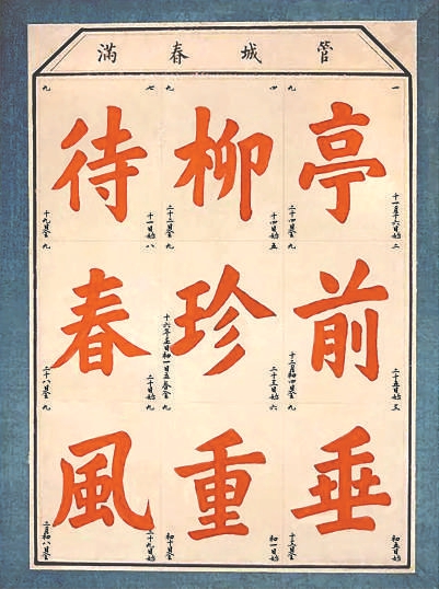 游戲者每日用紅色或彩色筆描填一筆,九個字填滿正是冬盡春來之時。最流行的九個字是“亭前垂柳珍重待春風”,此外還有“春前庭柏風送香盈室”“故城秋荒屏欄秋枯榮”“雁南飛柳芽香便是春”“待柬春風重染郊亭柳”“庭前春幽挾草巷重茵”“亭前屋后看勁柏峰骨”等等,以上每句的九個字的繁體都合九之數(shù),現(xiàn)代人也創(chuàng)作了簡體筆畫合乎九的句子,如“幽柏姿美濃蔭待春榮”。各句文字雖然不同,表達的都是盼春、迎春之意。
