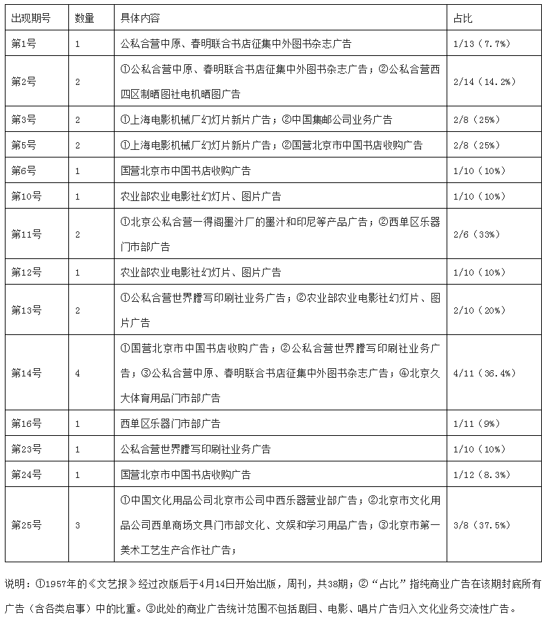 1957年《文藝報》刊載純商業(yè)廣告統(tǒng)計表