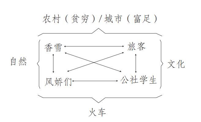 如圖所示,臺兒溝的香雪和鳳嬌們與城市的旅客(列車員)、公社同學處在分化、分離的兩極中。從語義角度看,香雪與旅客之間是一種對立關系,與公社同學之間是一種矛盾關系;鳳嬌們與香雪的公社同學構(gòu)成對立關系,與旅客構(gòu)成矛盾關系,她們處在既貧窮又沒有文化熏染的一個極點上。整個文本表意結(jié)構(gòu)建立在臺兒溝與城市之間的二元結(jié)構(gòu)關系上,二者又以火車為中介發(fā)生密切關聯(lián),調(diào)和矛盾,融合在一起。
