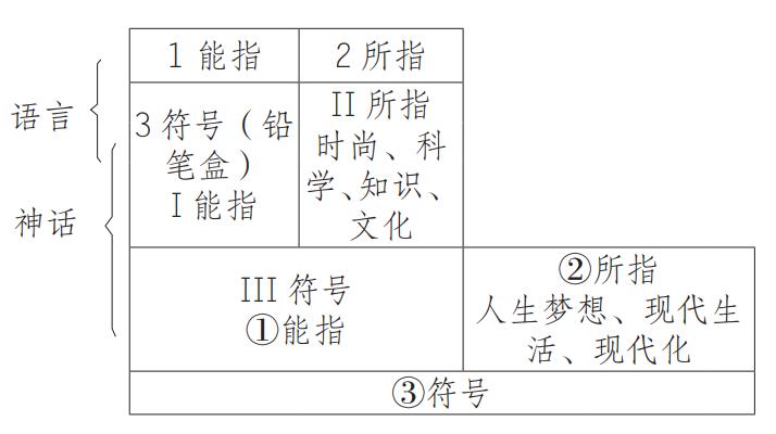 “現(xiàn)代神話”15意指作用的功能和機制是扭曲、變形、擴張、交替,等等,它由此從符號學而進入意識形態(tài)。羅蘭·巴特的“現(xiàn)代神話”理論對“解碼”《哦,香雪》中的鉛筆盒這一符號意涵具有方法論意義。為了闡釋得直觀、明晰,我們畫一個圖形如下: