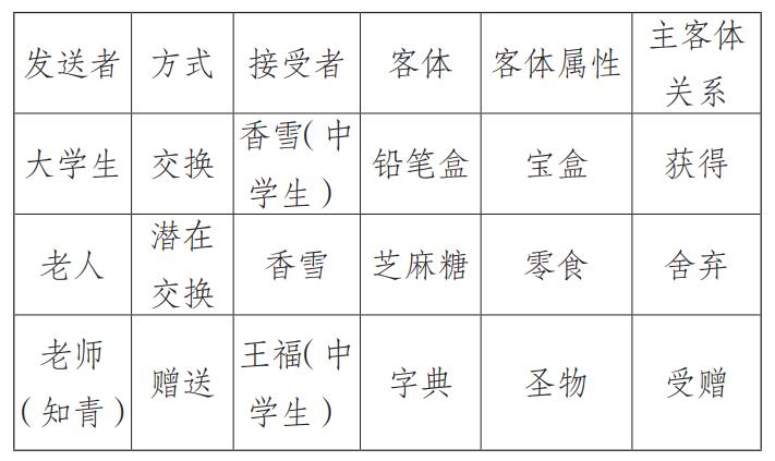 需要特別強調(diào)的是,價值客體與其所負載價值的遇合不是固定的,也不是孤立的,而是產(chǎn)生于具體的語義場中,小說是一步步為鉛筆盒賦值的,只有從敘述符號學層面上,通過辨析其符號意涵的轉(zhuǎn)換機制,才能將鉛筆盒的客體價值充分呈現(xiàn)出來。上述塑料鉛筆盒的所指意涵是在整個文本敘述行程中,在整體性的敘事邏輯和敘事結(jié)構(gòu)中產(chǎn)生出來的,也就是說,鉛筆盒以上意義僅僅因《哦,香雪》這一文本的存在而存在,是一種同它的敘述結(jié)構(gòu)和敘事流程密不可分的意義。