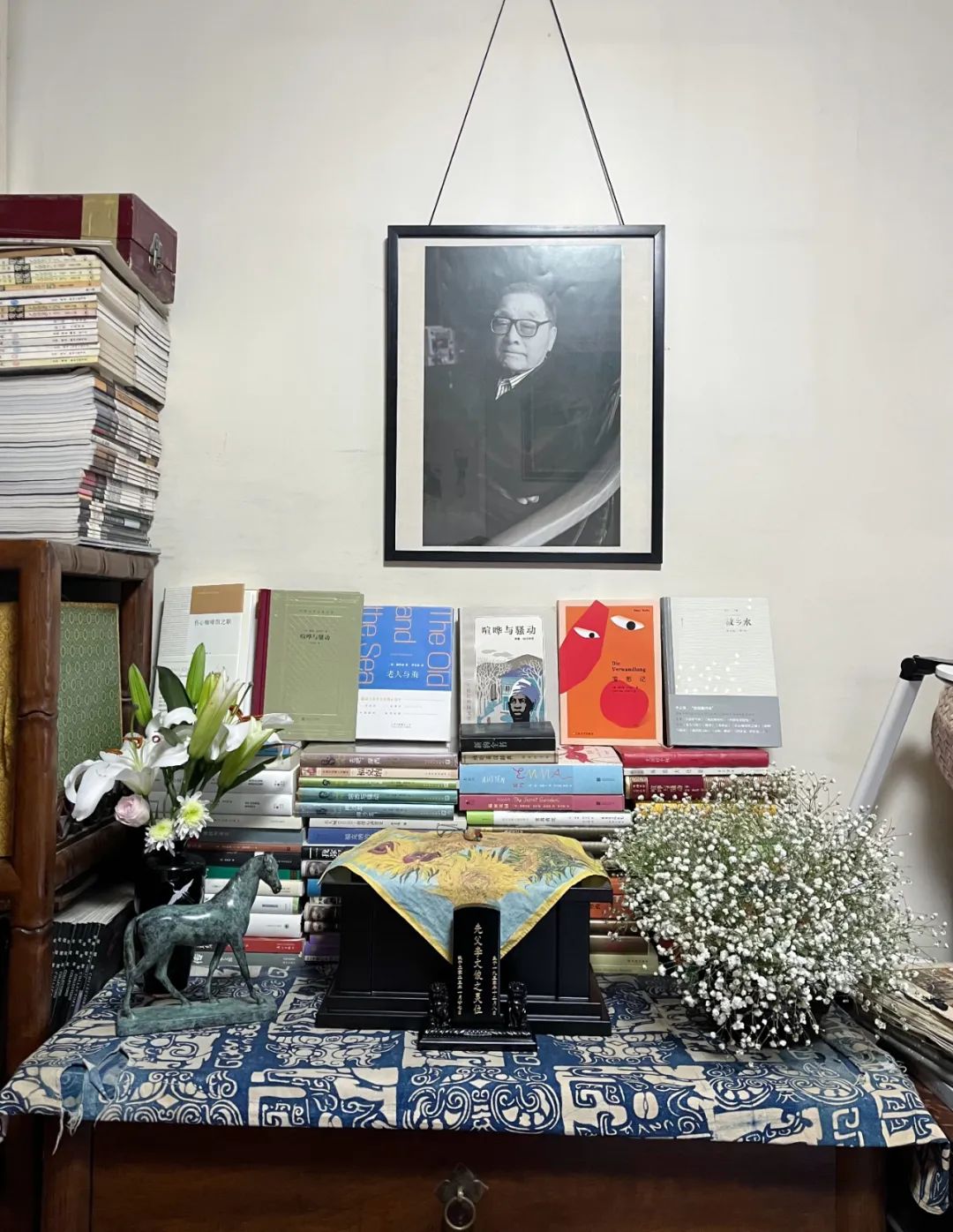 從八寶山殯儀館回來,我先去給老爸洗出遺像照片,回家掛在他的小房間。他生前自己淘的那些瓷瓶,我插滿鮮花擺滿房間,將他的譯作擺放在他的遺像下。太多了,只擺得下一小部分,我挑選了好看的版本。我記得他講過,他的書才是他一生的行李。
