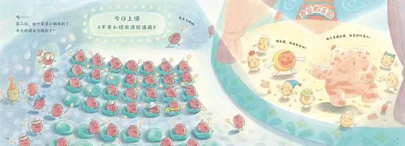 孔陽新照:在故事中,我希望能讓紅豆變魔術(shù)一般地變身,呈現(xiàn)出各種各樣美味的食物,但紅豆的“變身”讓我大費腦筋,因為紅豆變成紅豆沙的過程比較難表現(xiàn),如果把握不好角度,可能還讓小朋友覺得“碾碎”了的紅豆很可憐。直到有天靈光一閃,我想到了把“紅豆”和“數(shù)字”聯(lián)系在一起,通過減少紅豆的數(shù)量,幫助它們完成變身。