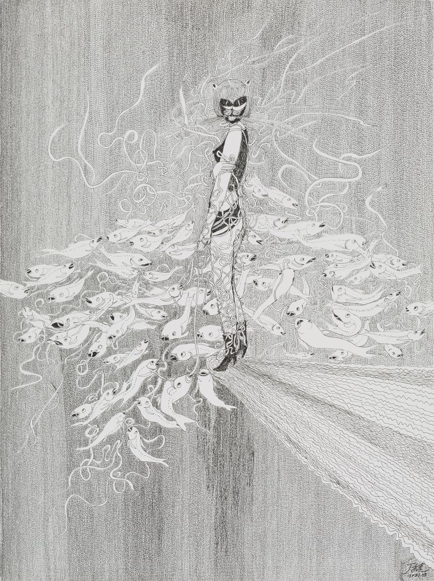 除了水墨,丁捷的線畫獨(dú)樹一幟,此作品《我們》曾參加日本福岡藝術(shù)雙年展。