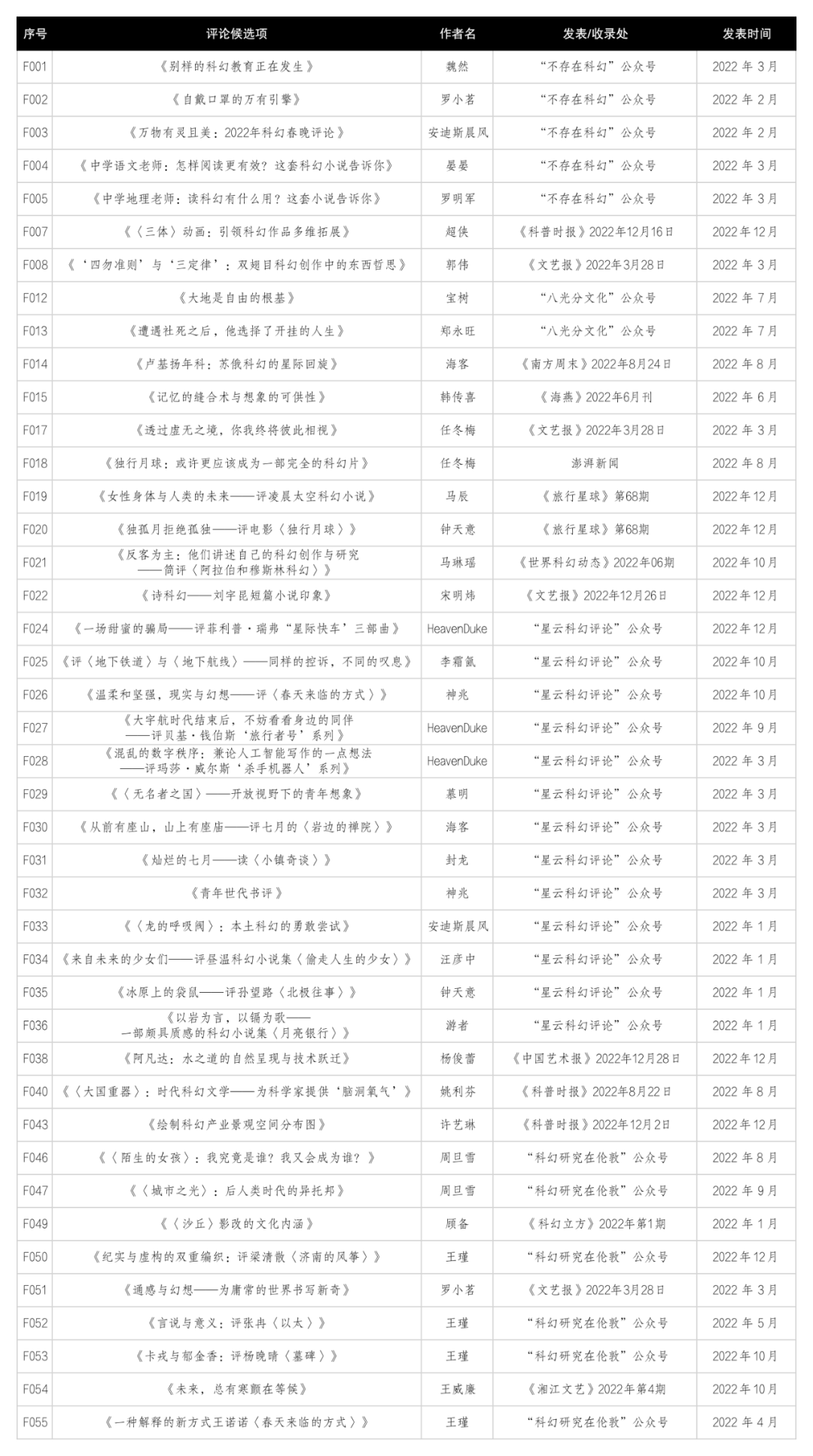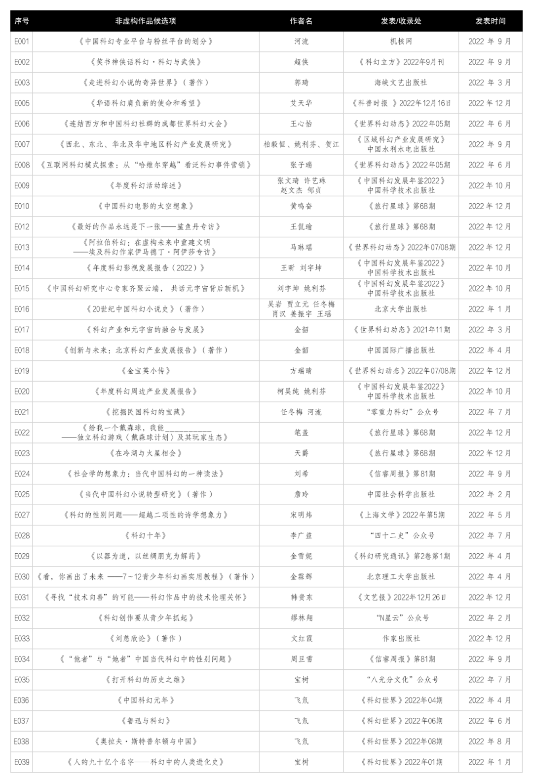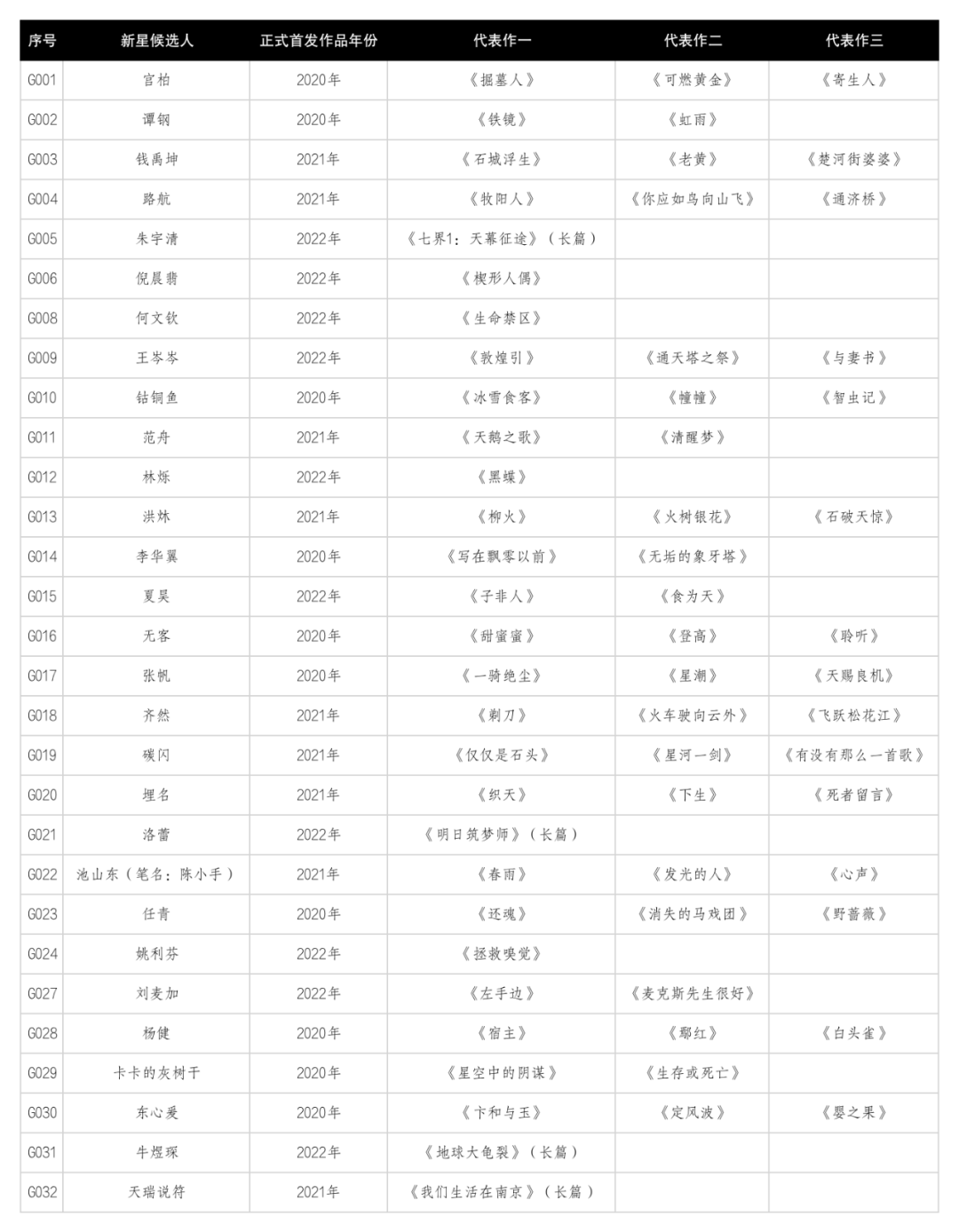 自2022年11月21日至2023年1月31日止,在第十四屆華語科幻星云獎(jiǎng)組織委員會(huì)的領(lǐng)導(dǎo)和薦選委員會(huì)的努力下,通過廣泛傳播、組織征集和重點(diǎn)邀約等多種方式,收到來自各個(gè)出版社、科幻文學(xué)類別的雜志社和一些科幻類的出品機(jī)構(gòu)、非紙質(zhì)專業(yè)平臺(tái)以及作者個(gè)人的推薦和自薦參評的作品和人選,共計(jì)392項(xiàng)申報(bào),其中經(jīng)查符合參評標(biāo)準(zhǔn)并通過候選資格復(fù)核的有長篇小說25項(xiàng)、中篇小說49項(xiàng)、短篇小說123項(xiàng)、翻譯作品51項(xiàng)、非虛構(gòu)作品36項(xiàng)、評論42項(xiàng)、新星獎(jiǎng)29人(不含其他專項(xiàng)獎(jiǎng)、特別獎(jiǎng))。