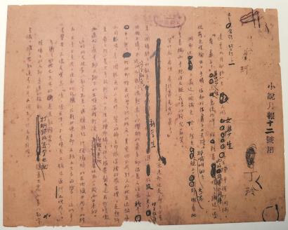 最后是編輯技術(shù)處理,也頗多未解之謎。稿紙每篇第一頁上鈐有“小說月報□□號用”的藍(lán)色印章,這不奇怪,是編輯部的用稿印證。但每頁上還有一個橢圓形的藍(lán)色印章,印文是“華字部公證圖章”,商務(wù)印書館印刷所有華字部、華英字部、西字部、中文校對部、西文校對部等等部門,但“公證”究為何用,卻不能很肯定。手稿上還留下編輯標(biāo)注的排版格式,編輯術(shù)語稱為“劃版樣”。排版編輯的字,似乎是另一個人的字,但《莎菲女士的日記》的編輯修改更多,因為是日記體,每一天的上方,都標(biāo)注字號:“五號方頭——”。其字體也與另兩篇的編輯字一致,這說明,這一篇的批改文字雖然與美編一樣用的是紅墨水,也有可能是葉圣陶的處理。當(dāng)然,這些還都是值得進(jìn)一步研究的。