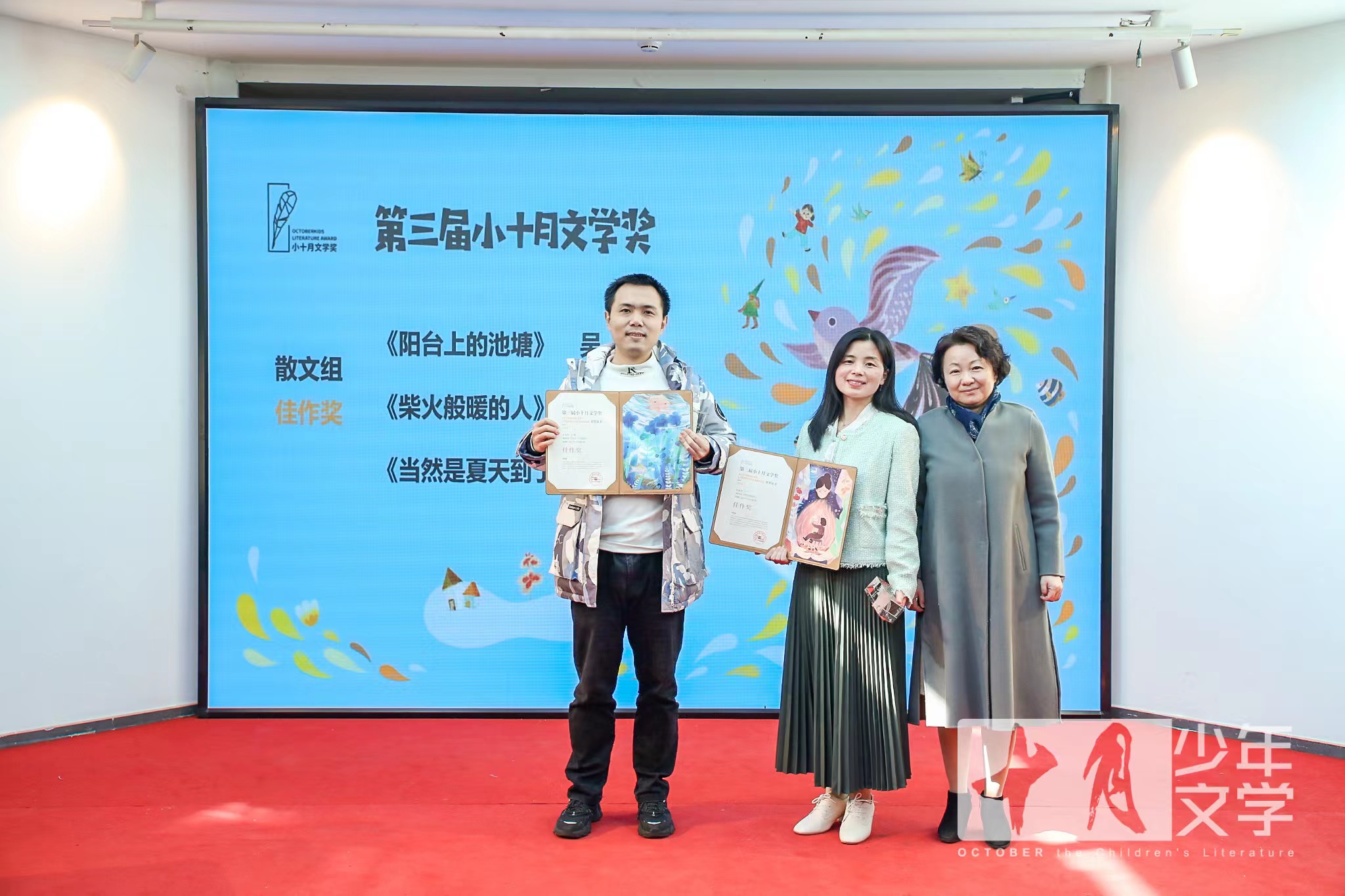 小十月文學(xué)獎(jiǎng)評(píng)委徐妍(左一)、李紅葉(右一)為童話組佳作獎(jiǎng)獲獎(jiǎng)作家頒獎(jiǎng)