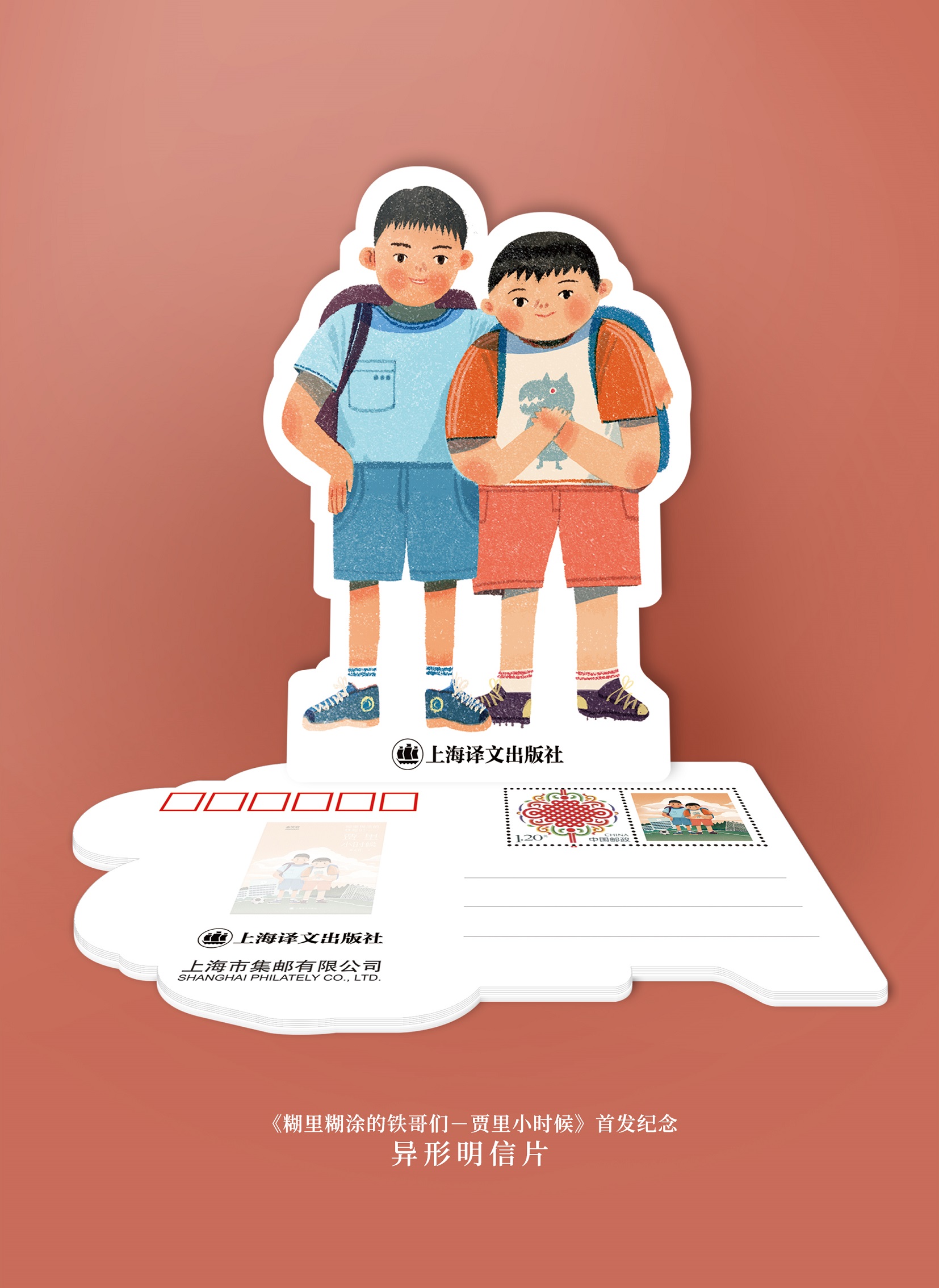 為了鼓勵小讀者們通過書信的方式把最新的閱讀體驗反饋給作家,上海譯文出版社聯(lián)合中國郵政共同設(shè)計定制了《糊里糊涂的鐵哥們——賈里小時候》紀(jì)念郵品——郵票、郵戳、異形明信片和紀(jì)念郵封。郵品選用由知名自由插畫師Lisk Feng特別為新書設(shè)計的封面插圖為底稿,主要凸顯了小學(xué)時期就成為鐵哥們的賈里和魯智勝之間的友誼。