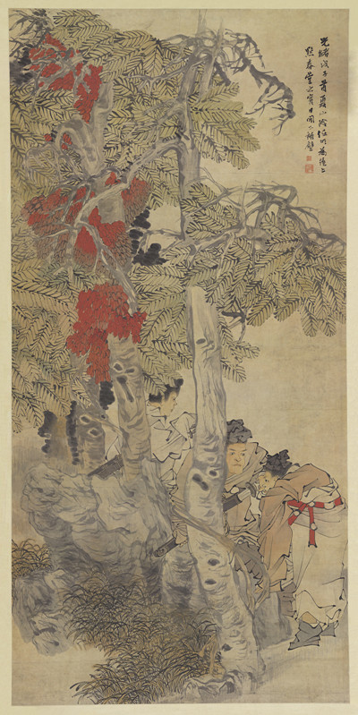 任畫多英雄氣,畫中英雄氣,千秋猶凜然,因此如何表現(xiàn)其“英雄氣”,是觀畫的一個關(guān)注點或重點。畫中撲入眼簾的,首先是那一樹紅色,是老樹上掛的藤蔓,紛披著紅花紅葉,燦爛照眼。而右下人物的紅腰帶與之相映,全圖生色。