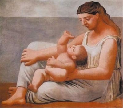 在畢加索藝術(shù)人生的“新古典主義”時期,他創(chuàng)作了大量擁有具象特征與古典美感的形象,其中以妻子奧爾加為藍本的畫作尤為出色。創(chuàng)作于1921年的《母與子》(見圖,李笑男供圖)描繪了畢加索的妻子與兒子,畫中人物具有豐沛的體量感,淡淡的藍色與白色色調(diào)突出人物溫暖的身體。在構(gòu)圖上,古典藝術(shù)中的水平與垂直關(guān)系占據(jù)主導,賦予作品古典的質(zhì)樸與簡潔。畫面背景僅由3個色帶組成,暗示了天空、海洋和未來,與母親形象的幾何形態(tài)形成溫柔共振。母親的姿態(tài)加強了水平方向構(gòu)圖帶來的平衡感與秩序性,孩子活潑天真、自然擺動的小腿則賦予寧靜莊嚴的畫面以動感。