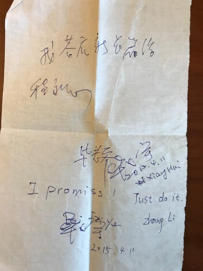 “當(dāng)時(shí)喝到一半,很歡快?!背逃佬赂嬖V澎湃新聞?dòng)浾?,“我說(shuō)‘你的新長(zhǎng)篇要給我啊’,畢飛宇喝大了,就說(shuō)‘好呀’,我趕緊拿出一張餐巾紙,在上面一字一字寫下‘我答應(yīng)新長(zhǎng)篇給程永新’,署名‘畢老爺’。然后我把紙交給他,他就在紙上簽了自己的名字,還寫了行英文‘I Promise’。”