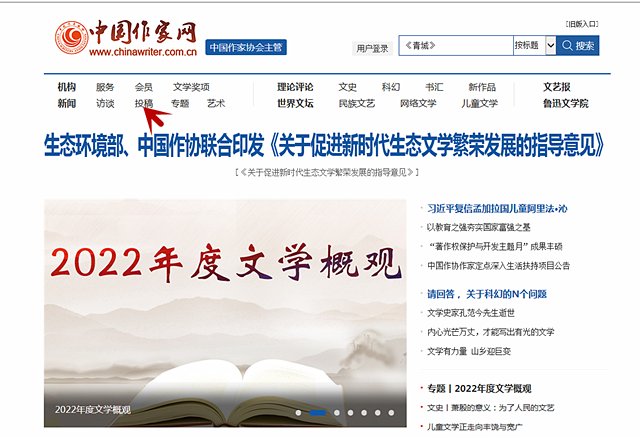 1、首先登錄中國作家網(wǎng)http://www.xpornx.net/ 在首頁頂端頻道分類位置找到“投稿”(標紅色箭頭處),點擊進入原創(chuàng)頻道。