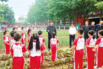 隨后,習(xí)近平來到學(xué)生農(nóng)場。這里是學(xué)生開展農(nóng)業(yè)種植活動(dòng)的實(shí)踐場所,陽光下、田壟上,一排排綠油油的菜苗生機(jī)勃勃。孩子們拿著水桶、鏟子、耙子、毛筆,為西紅柿、黃瓜等澆水、松土、除草、授粉。習(xí)近平強(qiáng)調(diào),很多知識(shí)和道理都來自勞動(dòng)、來自生活。引導(dǎo)孩子們從小樹立勞動(dòng)觀念,培養(yǎng)勞動(dòng)習(xí)慣,提高勞動(dòng)能力,有利于他們更好地學(xué)習(xí)知識(shí)?,F(xiàn)在一些城里的孩子接觸農(nóng)村、接觸大自然少,不光“四體不勤”,而且“五谷不分”,對吃的是什么、從哪里來的、怎么來的都不知道,更體會(huì)不到“誰知盤中餐,粒粒皆辛苦”。他對同學(xué)們說,認(rèn)識(shí)大自然,首先要從認(rèn)識(shí)身邊的植物開始。同學(xué)們栽培的各種植物,雖然書本上都有介紹,但大家親手種、親自培育、跟蹤觀察,收獲肯定是不一樣的。希望同學(xué)們從“學(xué)農(nóng)”中感受到農(nóng)作的艱辛和農(nóng)民的不易,從小養(yǎng)成熱愛勞動(dòng)、珍愛糧食、尊重自然的良好習(xí)慣,為建設(shè)美麗中國作貢獻(xiàn)。新時(shí)代生態(tài)文明建設(shè)要從娃娃抓起,通過生動(dòng)活潑的勞動(dòng)體驗(yàn)課程,讓孩子親自動(dòng)手、親身體驗(yàn)、自我感悟,讓“綠水青山就是金山銀山”的理念早早植入孩子的心靈。