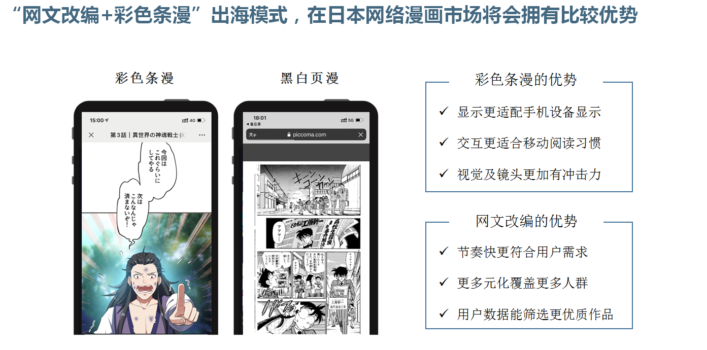 日本的網絡漫畫主要有黑白頁漫和彩色條漫兩種形式。前者是紙質版黑白的頁漫掃描到網絡上發(fā)行;條漫是彩色的,適合手機閱讀,有更好的視覺沖擊力。在日本,盡管網絡漫畫發(fā)展迅速,但條漫品類發(fā)展非常滯后。而中國網文數(shù)量龐大,具有故事性優(yōu)勢,玄幻、熱血、戀愛等題材適合制作條漫;產能方面,中國的網文和條漫的制作也有著流程化、工業(yè)化的成熟模式。發(fā)揮網絡文學內容優(yōu)勢,加強對日條漫傳播,將以新的增長點助力網文出海規(guī)模的擴大。