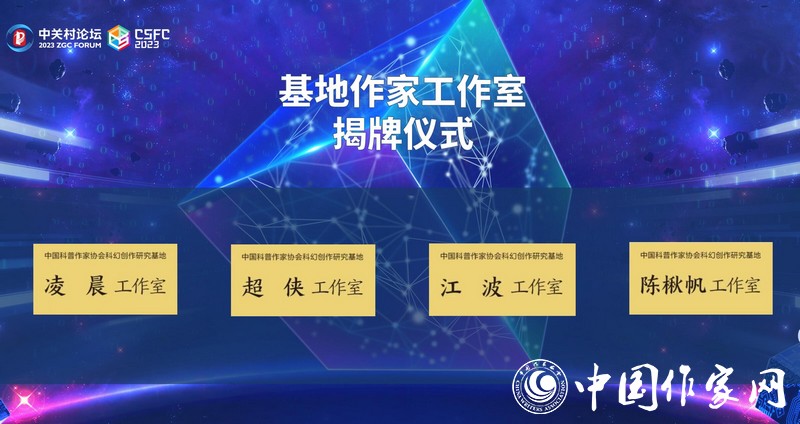 會(huì)上舉行了基地作家工作室揭牌儀式。尹傳紅、王泉根、王晉康、劉慈欣、趙暉等為凌晨工作室、超俠工作室、江波工作室和陳楸帆工作室揭牌。至此,科幻基地已經(jīng)為14位作家成立了工作室。