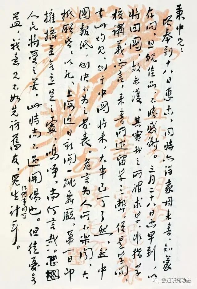 今日閱報,驚悉先生逝世,雖是在辦公室中,不禁伏案慟哭。秉中之得有今日,皆先生之賜。十年來奔走不寧,未能償侍先生講學之志,誠可痛心。然平日對人處事,一體先生真誠態(tài)度,不敢有辱先生,此敢告我先生在天之靈者也。海嬰弟方數(shù)歲,教養(yǎng)之責,全在師母。伏望節(jié)哀,毋損尊體,以肩巨任。回思前日在滬,先生云“病中亦不能停筆休養(yǎng),因停筆不單醫(yī)藥遂停,即飯亦不得吃也”。痛哉此言,秉中返京二十余日來,晨夕耳中皆如聞先生此言,然又束手無策,不能有所奉助。時時懷念先生病體,而俗務累人,竟未能奉書問候,而今竟成終天之憾事。前次先生面允書數(shù)字見賜,病中當尚未書就,敢請師母覓先生所書物事賜寄,以存手澤。