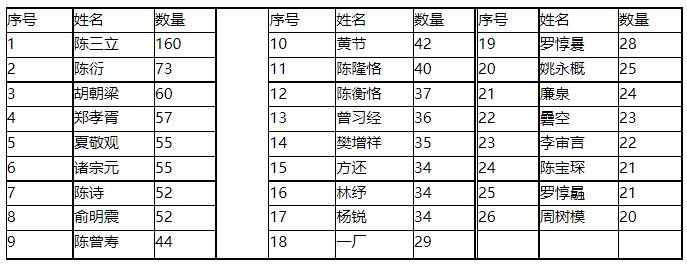北京《晨報(bào)》(包括前身《晨鐘》),1916年8月15日創(chuàng)刊時(shí)辟有“文苑”欄目,至1919年7月3日“文苑”最后一期,近三年時(shí)間共發(fā)表了200多位詩(shī)人的作品,其中詩(shī)歌數(shù)量達(dá)到或超過(guò)20題的詩(shī)人有26位: